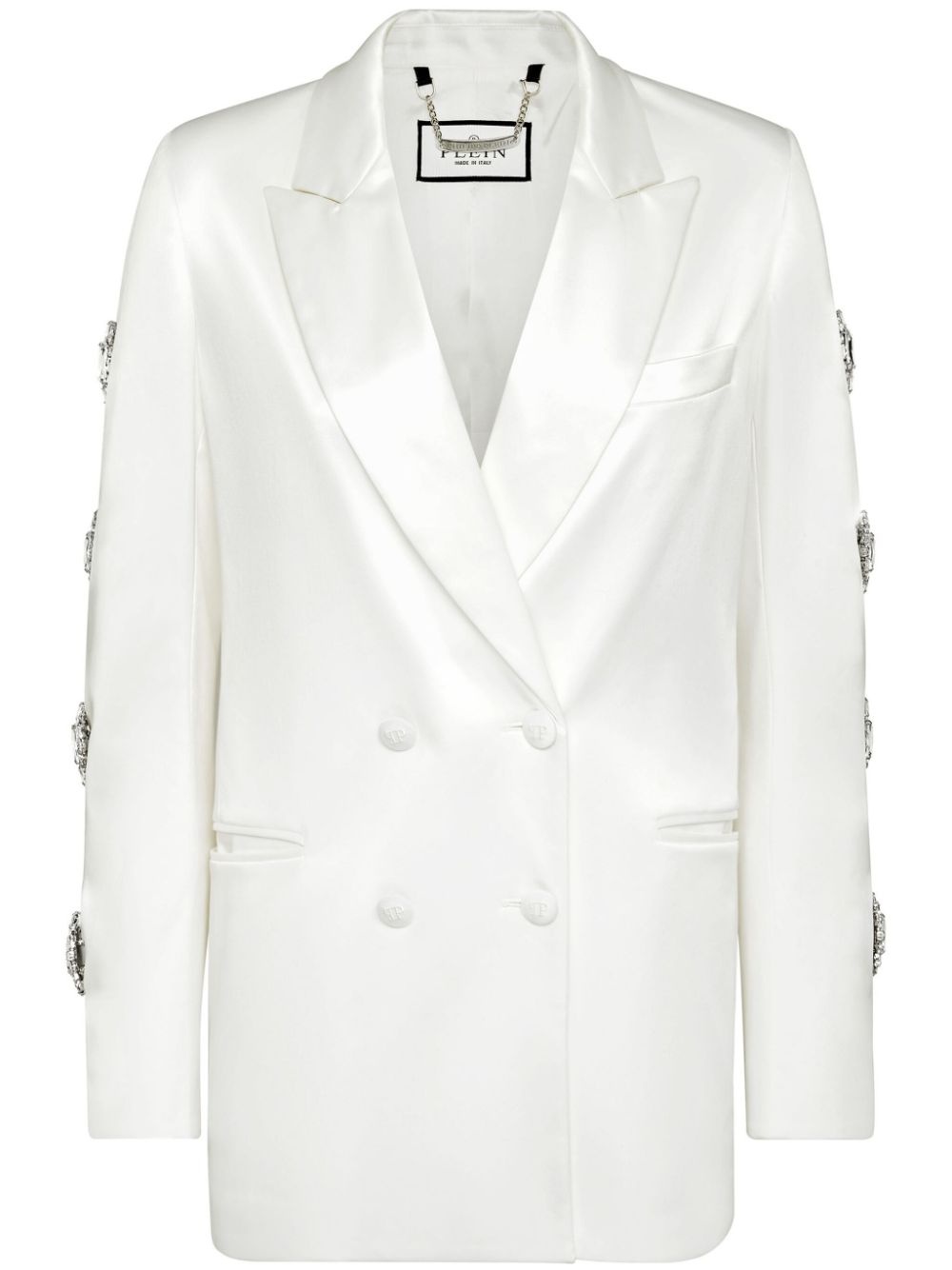 double-breasted cut-out blazer Highlights - White - Crystal embellishment - Cut-out detailing - Notched lapels - Double-breasted button fastening - Long sleeves - Two front jetted pockets - Chest welt pocket - Straight hem Made in Italy Composition Polyester 60%, Cotton 37%, Elastane 3% Washing instructions Read Manufacturer Guidelines