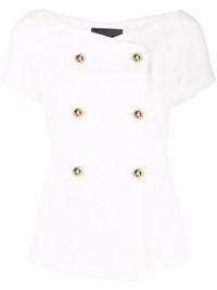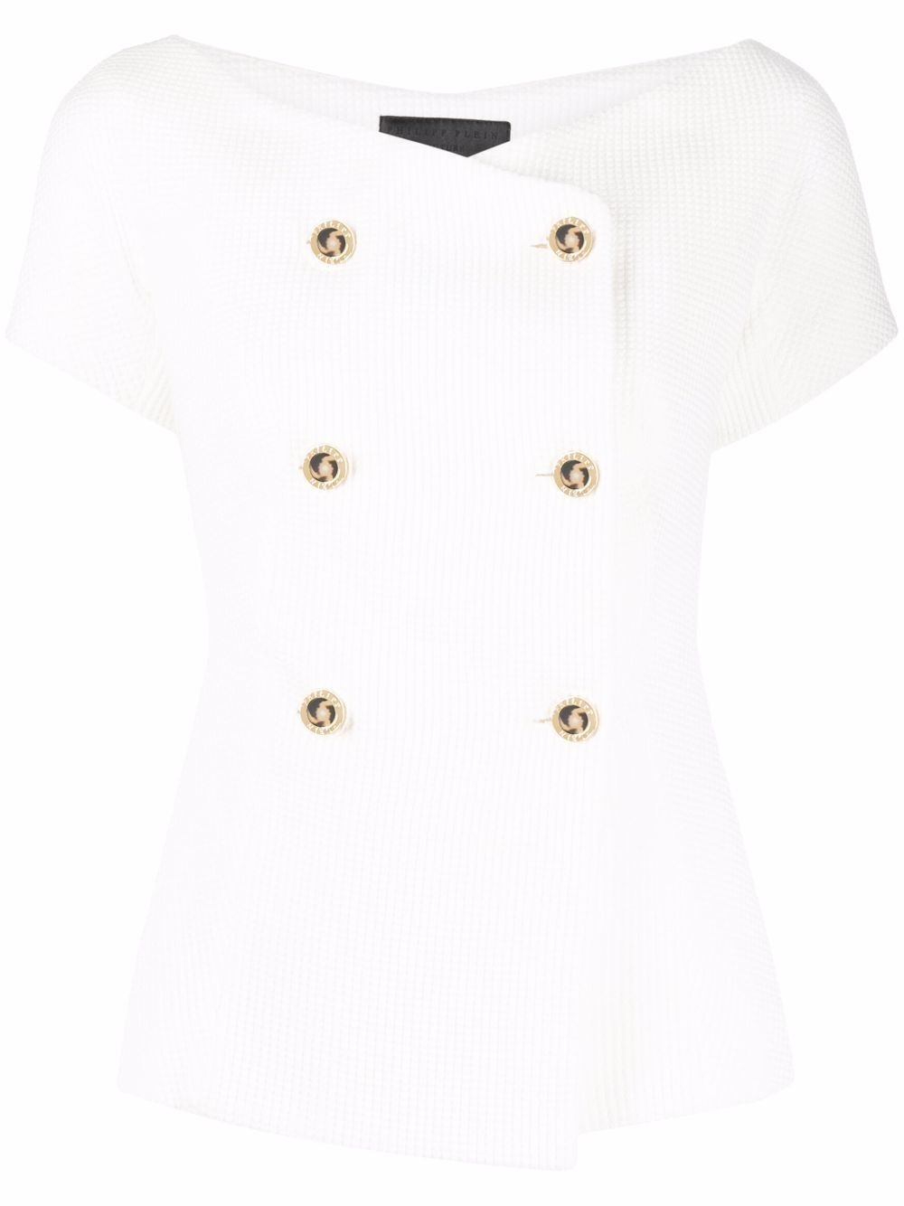double-breasted short-sleeve blazer Philipp Plein's double-breasted white blazer exhibits the brand's penchant for unique tailoring. Featuring a boat neck and short sleeves, the fitted design is fastened with gold-tone buttons for a sculpted silhouette. Made in Italy Composition Lining: Polyester 100% Outer: Cotton 100% SIZE & FIT Model measurements Height 5 ft 10 in(1.77 m) Bust/Chest 32.28 in(82 cm) Hips 35.03 in(89 cm) Waist 25.19 in(64 cm) FittingInformation This piece fits true to size. We recommend you get your regular size Cut for a slim fit Made with a mid-weight non-stretch fabric Washing instructions Machine Wash