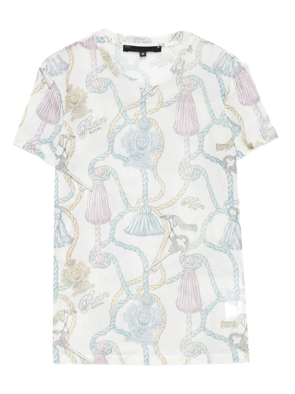 elaborated T-shirt Highlights - White - Rope pattern - Tassel detail - Short sleeves - Crew neck - Sheer fabric Imported Composition Polyester 85%, Elastane 15% Washing instructions Read Manufacturer Guidelines