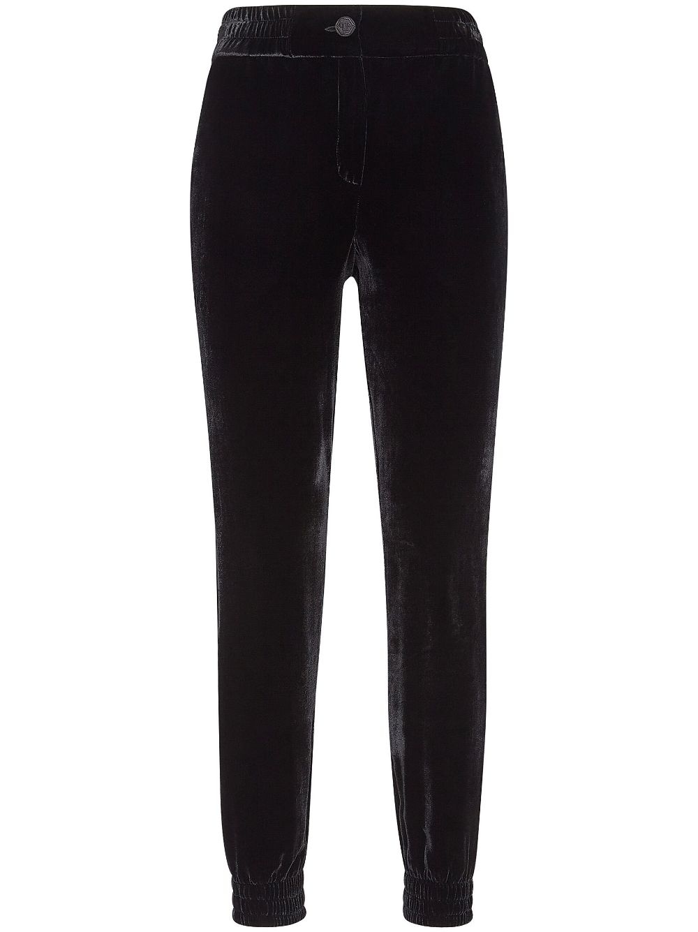 elasticated-waist velvet trousers Highlights - Black - Stretch-design - Velvet - Mid-rise - Elasticated ankles - Elasticated waistband - Front button and zip fastening - Tapered leg - Two side slit pockets Made in Italy Composition Viscose 82%, Silk 18%