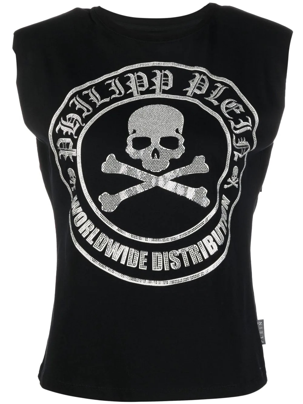 embellished-logo sleeveless T-shirt black cotton crystal embellishment skull print to the front logo print to the front logo patch to the rear shoulder pads round neck sleeveless straight hem Imported Composition Cotton 100% SIZE & FIT Model measurements Height 6 ft 2 in(1.89 m) Bust/Chest 37.4 in(95 cm) Hips 36.61 in(93 cm) Waist 29.13 in(74 cm) FittingInformation This piece fits true to size. We recommend you get your regular size Cut for a relaxed fit Made with a mid-weight fabric Washing instructions Hand Wash
