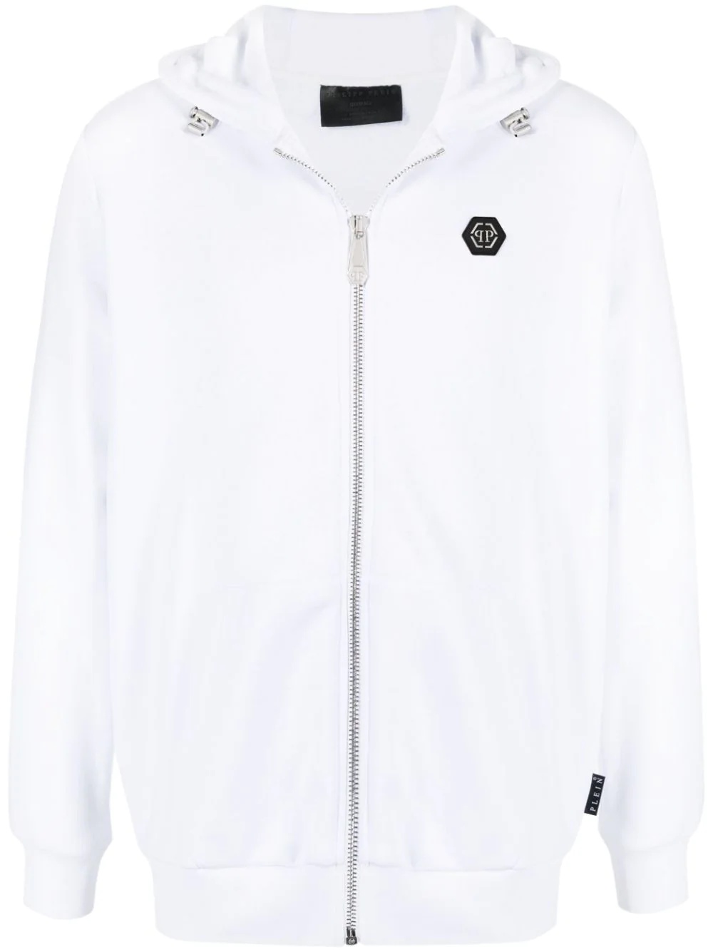 embellished skull logo-print zip hoodie In line with German designer Philipp Plein's dark aesthetic and grungy style, this white hoodie features a skull print at the rear, an ongoing iconic subject revisited throughout his collections. Imported Composition Outer: Glass Fiber 100%, Cotton 88%, Polyester 12% Lining: Cotton 100% SIZE & FIT Model measurements Height 6 ft 1 in(1.85 m) Bust/Chest 34.64 in(88 cm) Hips 34.25 in(87 cm) Waist 27.55 in(70 cm) FittingInformation This piece fits true to size. We recommend you get your regular size Cut for a relaxed fit Made with a mid-weight fabric Washing instructions Hand Wash