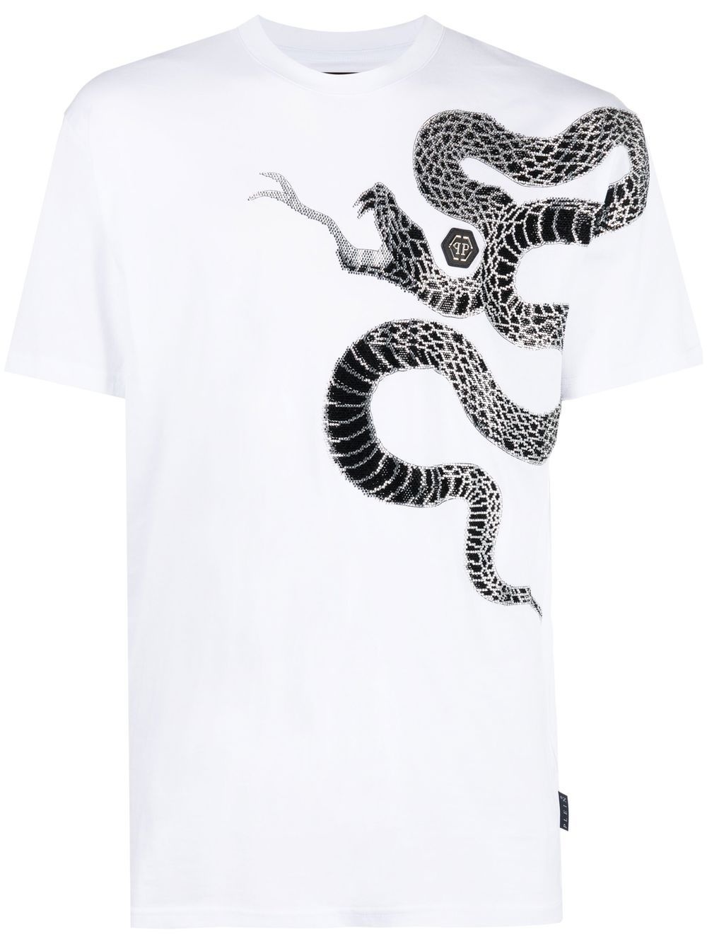 embellished snake-print T-shirt white cotton rhinestone embellishment logo patch at the chest crew neck short sleeves straight hem Imported Composition Cotton 100% SIZE & FIT Model measurements Height 6 ft 2 in(1.88 m) Bust/Chest 36.61 in(93 cm) Hips 35.82 in(91 cm) Waist 27.95 in(71 cm) FittingInformation Designed to be unstructured, offering a loose fit throughout Made from a midweight non-stretch fabric, this piece offers minimal elasticity when worn This piece fits true to size – take your usual size Washing instructions Hand Wash