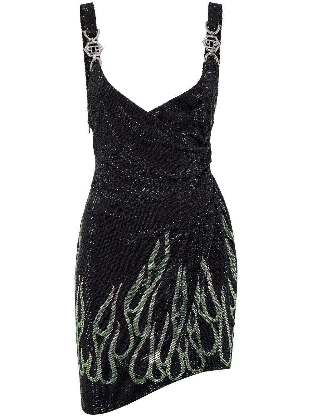 Flame mini dress Highlights - Black - Plunging v-neck - Flame print - Open back - Asymmetric design Imported Composition Polyester 100%