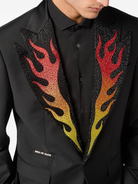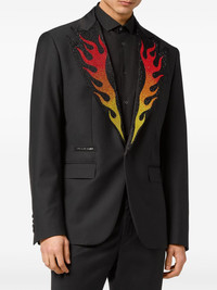 Flame single-breasted blazer Highlights - Jet black/flame red - Applique logo - Flame print - Crystal embellishment - Notched lapels - Front button fastening - Long sleeves - Buttoned cuffs - Jetted chest pocket - Two front flap pockets - English rear vents Made in Italy Composition Lining: Viscose 51%, Acetate 49% Outer: glass 100%, Polyester 53%, Virgin Wool 43%, Elastane 4%