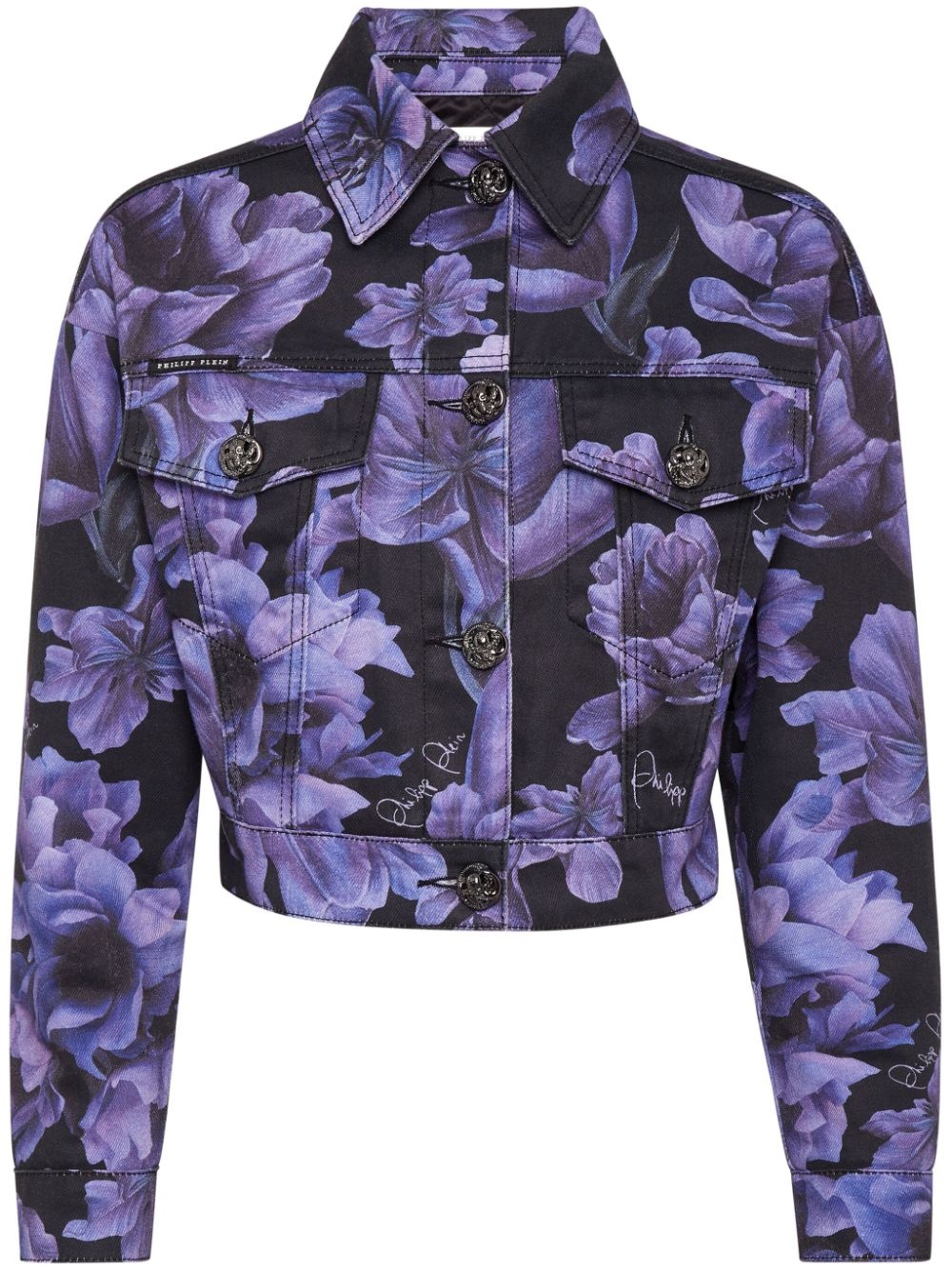 floral-print cropped denim jacket Highlights - Black/purple - Cotton - All-over floral print - Logo patch to the rear - Classic collar - Front button fastening - Long sleeves - Buttoned cuffs - Two chest flap pockets - Straight hem - Cropped Imported Composition Outer: Cotton 100% Lining: Polyester 100% Washing instructions Read Manufacturer Guidelines
