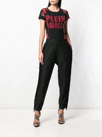 fringed trim track pants Famed German fashion designer Philipp Plein is renowned across the globe for his dark and grungy aesthetic, as well as his exquisitely designed activewear pieces. These black fringed trim track pants from Philipp Plein feature an elasticated waistband, side slit pockets, tonal pyramid studs, a tapered leg, ribbed cuffs, a relaxed fit and a rear logo plaque. Made in Italy Composition Acetate 100%, Viscose 100% SIZE & FIT Model measurements Height 5 ft 10 in(1.78 m) Bust/Chest 33.46 in(85 cm) Hips 36.22 in(92 cm) Waist 23.22 in(59 cm) Washing instructions Machine Wash