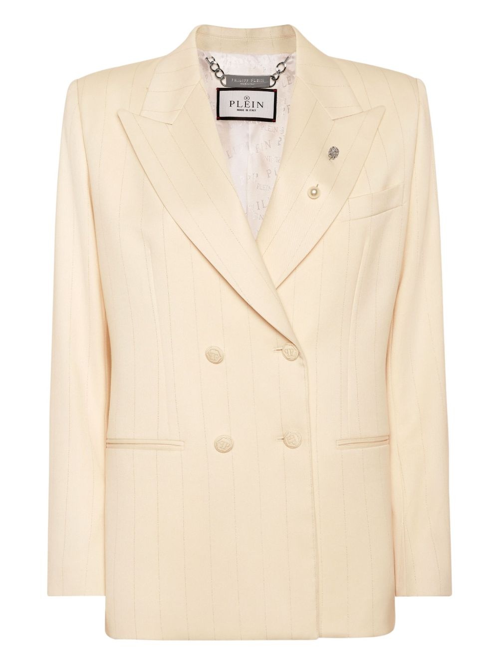 "Gold Fit blazer Highlights - White - Double-breasted button fastening - Wide notch lapels - Jetted chest pocket - Brooch detail Made in Italy Composition Outer: Polyester 70%, Viscose 25%, Elastane 5% Lining: Acetate 52%, Viscose 48%