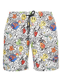 graphic-print swim shorts Highlights - White - Elasticated drawstring waistband - Two side slit pockets - Mid-rise - Be mindful to try on swimwear over your own garments. Imported Composition Polyester 100%