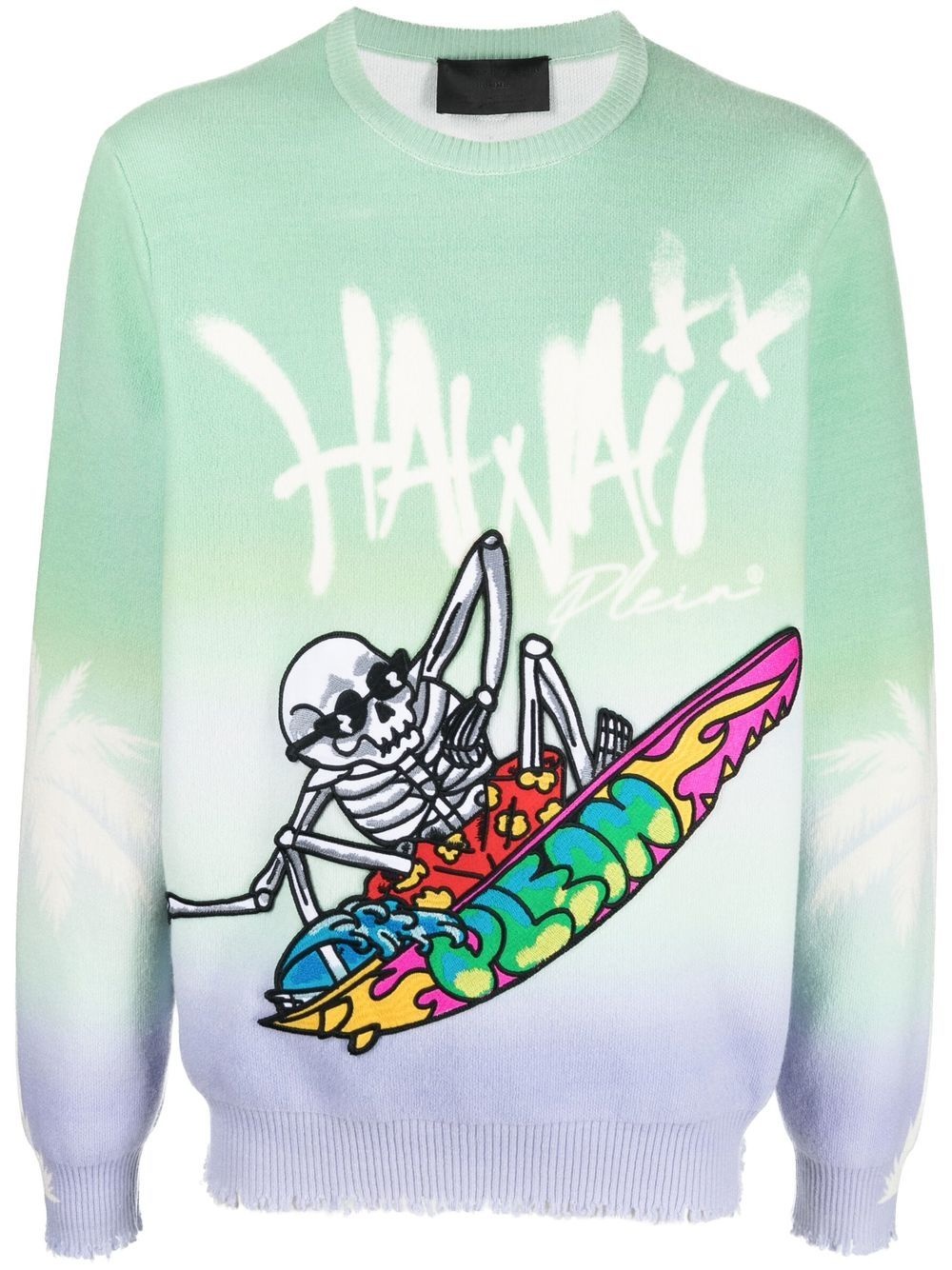 Hawaii graphic-print jumper multicolour lambs wool-cotton blend knitted construction ribbed-knit edge ombre effect graphic print to the front logo patch to the rear logo print to the rear crew neck long sleeves frayed hem Made in Italy Composition Lambs Wool 70%, Cotton 30% SIZE & FIT Model measurements Height 6 ft 1 in(1.85 m) Bust/Chest 31.88 in(81 cm) Hips 33.07 in(84 cm) Waist 26.77 in(68 cm) FittingInformation This piece fits true to size. We recommend you get your regular size Cut for a relaxed fit Made with a mid-weight fabric Washing instructions Dry Clean Only