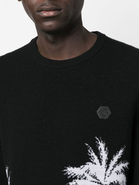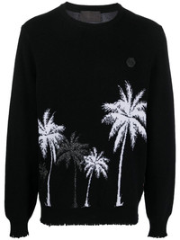 Hawaii jacquard wool pullover black merino wool blend jacquard logo motif logo patch to the rear crew neck long sleeves ribbed cuffs ribbed hem ripped detailing Made in Italy Composition Merino 95%, Metallized Polyester 5% SIZE & FIT Model measurements Height 6 ft 2 in(1.87 m) Bust/Chest 36.41 in(92.5 cm) Hips 37 in(94 cm) Waist 29.52 in(75 cm) FittingInformation This piece fits true to size. We recommend you get your regular size Cut for a relaxed fit Made with a mid-weight fabric Washing instructions Dry Clean Only