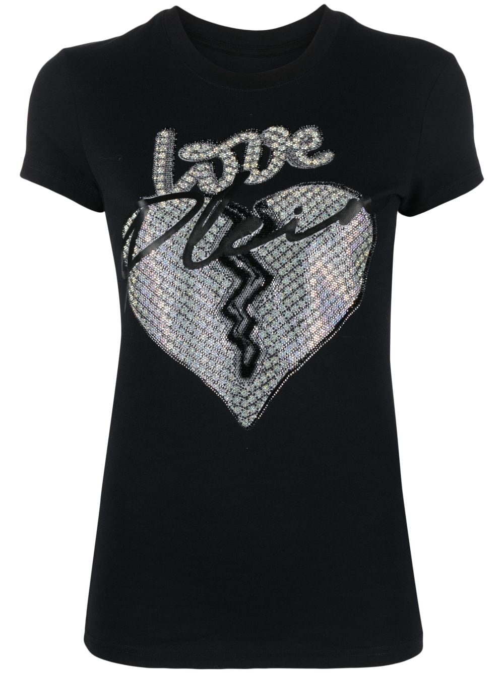 heart-motif rhinestone-embellished T-shirt Highlights - Black - Stretch-design - Rhinestone embellishment - Heart motif - Round neck - Short sleeves - Straight hem Imported Composition Polyester 95%, Elastane 5% SIZE & FIT Model measurements Height 5 ft 11 in(1.8 m) Bust/Chest 31.49 in(80 cm) Hips 35.43 in(90 cm) Waist 24.4 in(62 cm) FittingInformation Designed for a slim fit that sits just away from the body offering a close yet comfortable fit Made from a midweight stretch fabric, this piece offers elasticity and flexibility when worn This piece fits true to size – take your usual size Washing instructions Hand Wash