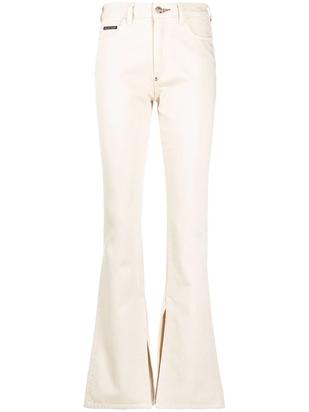 high-waisted flared jeans beige twist cotton high-waisted belt loops front button and zip fastening classic five pockets logo patch to the rear flared hem slit hem Imported Composition Lining: Cotton 100% Outer: Cotton 100% SIZE & FIT Model measurements Height 5 ft 11 in(1.8 m) Bust/Chest 31.49 in(80 cm) Hips 35.82 in(91 cm) Waist 24.8 in(63 cm) FittingInformation This piece fits true to size. We recommend you get your regular size Designed to be fitted at the waist and through the thigh, loose from the knee Made with a mid-weight non-stretch fabric Washing instructions Dry Clean Only