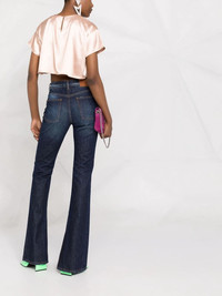 high-waisted flared jeans blue cotton denim stonewashed high waist belt loops front button and zip fastening classic five pockets logo patch to the rear flared hem slit hem Imported Composition Outer: Cotton 100% Lining: Polyester 65%, Cotton 35% SIZE & FIT Model measurements Height 5 ft 11 in(1.8 m) Bust/Chest 31.49 in(80 cm) Hips 36.61 in(93 cm) Waist 24.4 in(62 cm) FittingInformation This piece fits true to size. We recommend you get your regular size Designed to be fitted at the waist and through the thigh, loose from the knee Made with a mid-weight non-stretch fabric Washing instructions Hand Wash