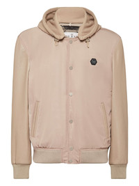 hooded bomber jacket Highlights - Beige - Leather sleeves - Hooded neckline - Button fastening - Side welt pockets - Logo patch Imported Composition Polyester 100% Outer: Polyester 100% Lining: Polyester 100%