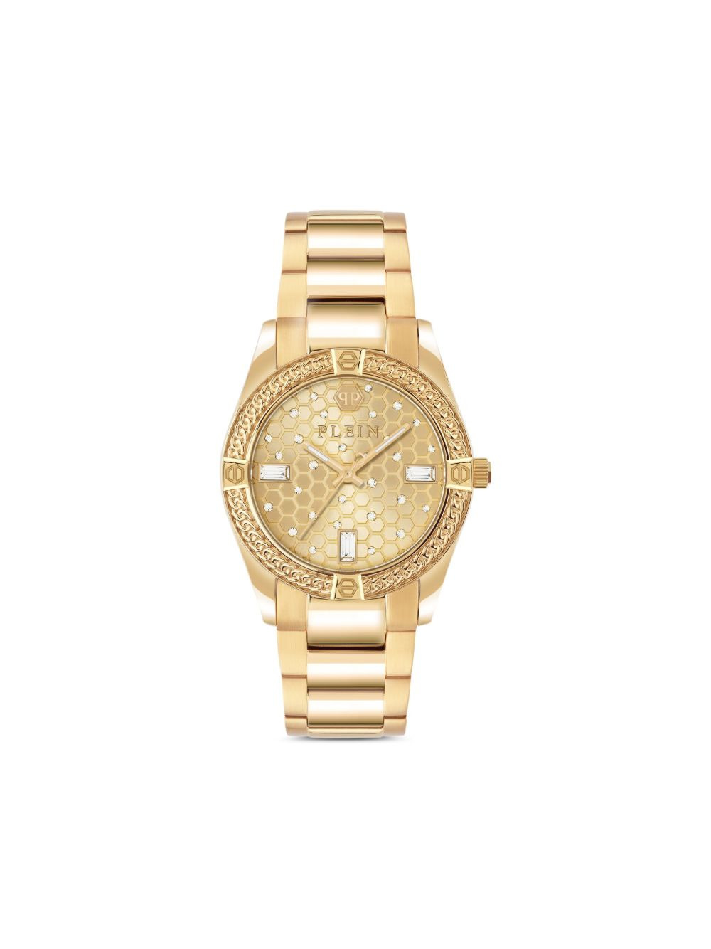Icon Chain 36mm Highlights - Gold-tone dial - Round case shape - 36mm case size - Honeycomb dial pattern - Chain-engraved bezel - Crystal-embellished dial - Quartz movement - Screw-in crown - This item comes with a standard one-year warranty from the boutique. Made in Italy SIZE & FIT Measurement DIAMETER 1.41 in(3.6 cm)