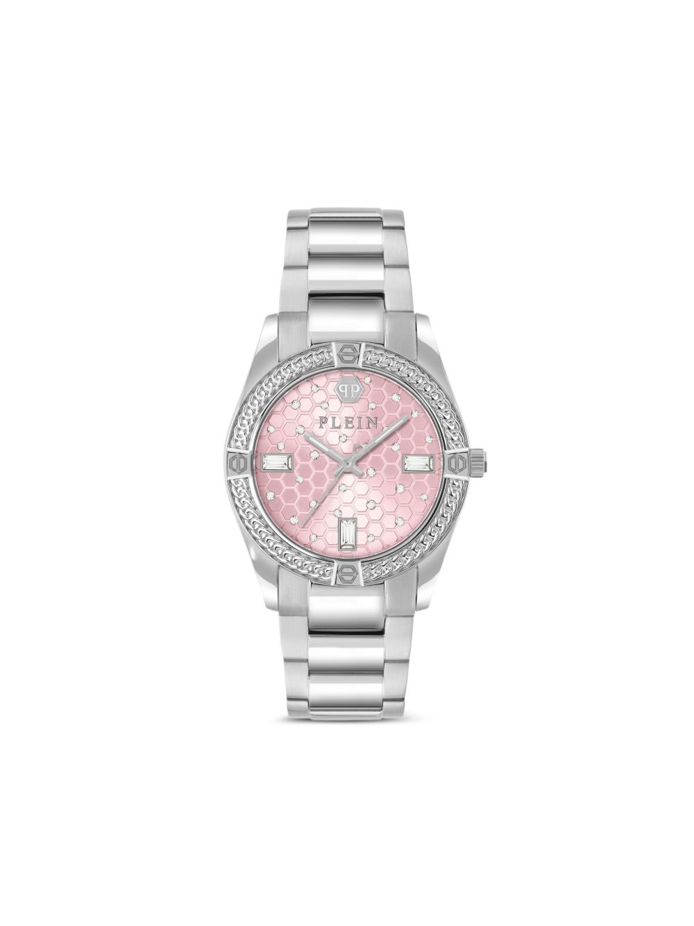 Icon Chain 36mm Highlights - Pink dial - Round case shape - 36mm case size - Honeycomb dial pattern - Chain-motif bezel - Crystal hour markers - Quartz movement - Date window sub-dial - Stainless steel - This item comes with a standard one-year warranty from the boutique. Made in Italy SIZE & FIT Measurement DIAMETER 1.41 in(3.6 cm)