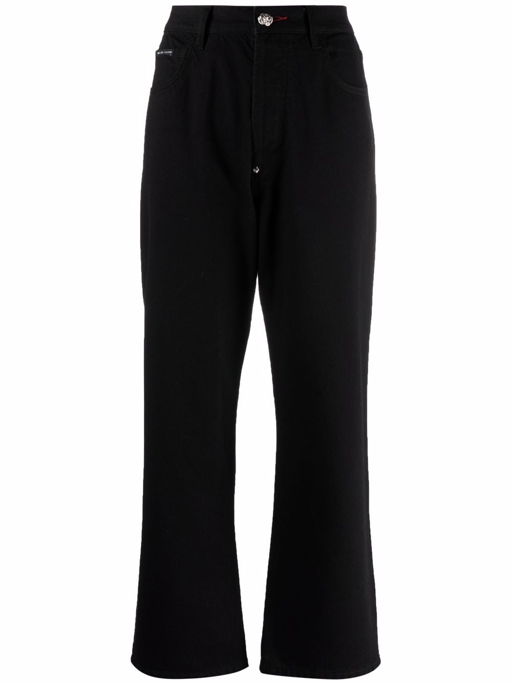 Iconic Plein loose-fit jeans black cotton-denim high waist belt loops front button and zip fastening classic five pockets Imported Composition Outer: Cotton 100% Lining: Polyester 65%, Cotton 35% SIZE & FIT Model measurements Height 5 ft 10 in(1.79 m) Bust/Chest 33.07 in(84 cm) Hips 35.82 in(91 cm) Waist 24.01 in(61 cm) FittingInformation This piece fits true to size. We recommend you get your regular size Designed to be fitted at the waist and hips, loose over the leg Made with a mid-weight non-stretch fabric Washing instructions Dry Clean Only