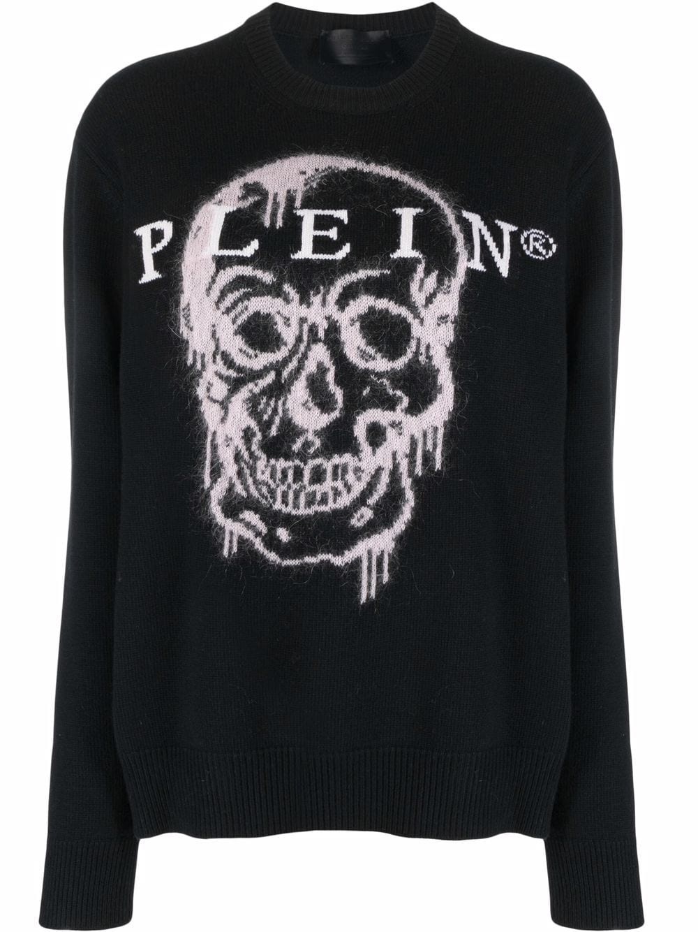 intarsia-knit skull jumper black wool-mohair blend knitted construction intarsia-knit logo skull print crew neck long sleeves drop shoulder ribbed cuffs ribbed hem Made in Italy Composition Wool 90%, Mohair 7%, Polyamide 3% SIZE & FIT Model measurements Height 5 ft 11 in(1.8 m) Bust/Chest 33.07 in(84 cm) Hips 37.4 in(95 cm) Waist 25.19 in(64 cm) FittingInformation This piece fits true to size. We recommend you get your regular size Cut for a relaxed fit Made with a mid-weight fabric Washing instructions Hand Wash