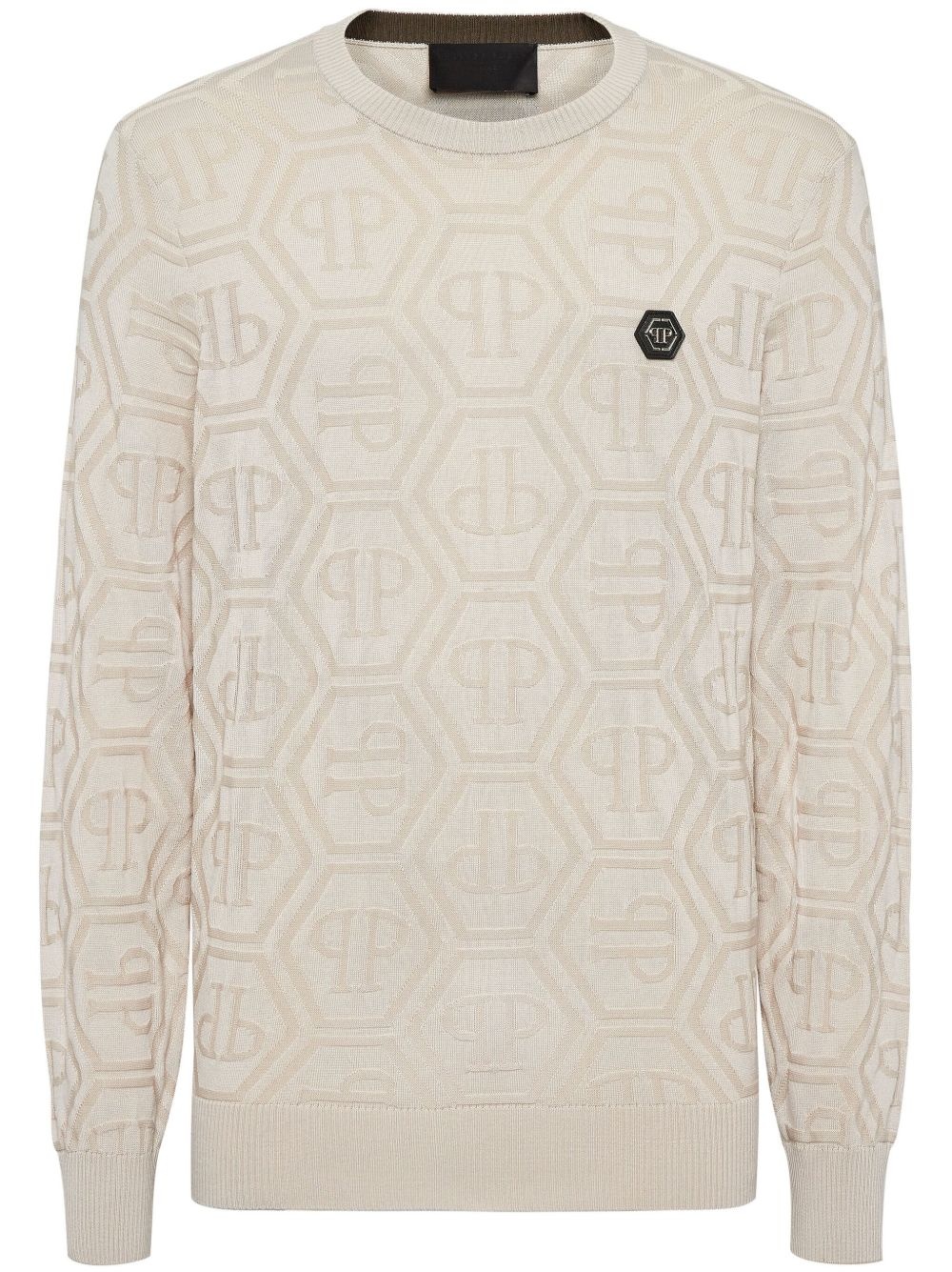 jacquard-logo sweater Highlights - Light beige - Crew neck - Long sleeves - Logo patch at the chest Made in Italy Composition Merino 50%, Silk 50%
