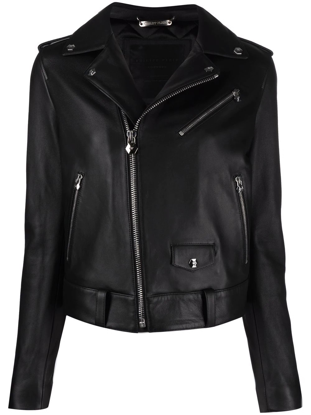 leather biker jacket black lambskin off-centre front zip fastening notched lapels multiple zip-fastening pockets straight hem belted waist tabs Imported Composition Outer: Lambskin 100% Lining: Polyester 100% SIZE & FIT Model measurements Height 5 ft 10 in(1.78 m) Bust/Chest 33.07 in(84 cm) Hips 36.61 in(93 cm) Waist 24.8 in(63 cm) FittingInformation This piece fits true to size. We recommend you get your regular size Cut for a slim fit Made with a mid-weight non-stretch fabric Washing instructions Specialist Cleaning