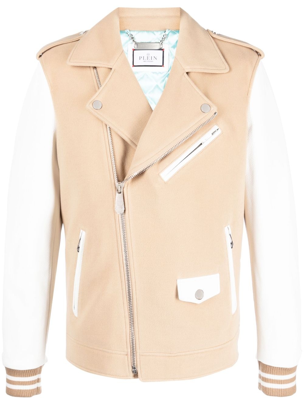 leather biker jacket Highlights - White/beige - Calf leather - Contrasting-fabric sleeves - Decorative button flap - Notched lapels - Off-centre front zip fastening - Long sleeves - Two side zip-fastening pockets - Zip-fastening chest pocket - Ribbed cuffs Imported Composition Outer: Fabric 60%, Calf Leather 40% Lining: Polyester 100% SIZE & FIT Model measurements Height 6 ft 2 in(1.87 m) Bust/Chest 38.18 in(97 cm) Hips 36.61 in(93 cm) Waist 29.13 in(74 cm) FittingInformation Designed to be unstructured, offering a loose fit throughout Washing instructions Specialist Cleaning
