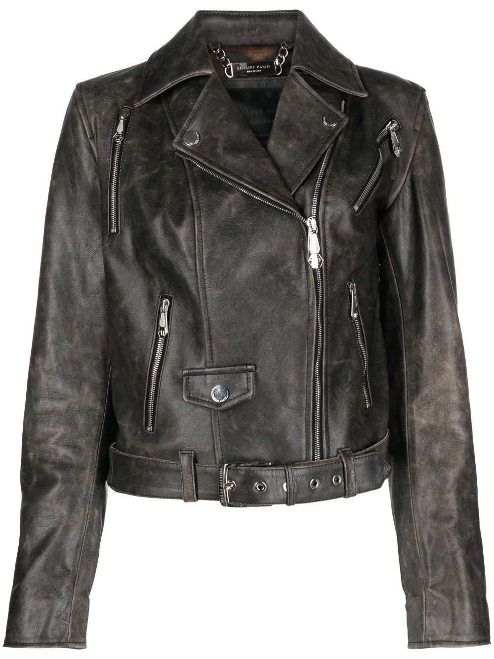 leather biker jacket Highlights - Smoky black - Leather - Notched lapels - Long sleeves - Straight hem - Off-centre front zip fastening - Two zip-fastening chest pockets Made in Italy Composition Lining: Viscose 100% Outer: Leather 100% SIZE & FIT Model measurements Height 5 ft 11 in(1.8 m) Bust/Chest 31.49 in(80 cm) Hips 35.43 in(90 cm) Waist 24.4 in(62 cm) FittingInformation Designed for a slim fit that sits just away from the body offering a close yet comfortable fit Firm leather offering little flexibility to maintain its durability and sturdiness This piece fits true to size – take your usual size Washing instructions Specialist Cleaning