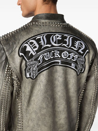 leather biker jacket Highlights - Black - Calf leather - Off-centre front zip fastening - Faded effect - Spike stud detailing - Silver-tone rockstud detailing - Notched collar - Applique logo - Two side zip-fastening pockets - Long sleeves - Logo patch to the rear - Straight hem Imported Composition Lining: Polyester 100% Outer: Calf Leather 100%, Acrylonitrile Butadiene Styrene (ABS) 100%