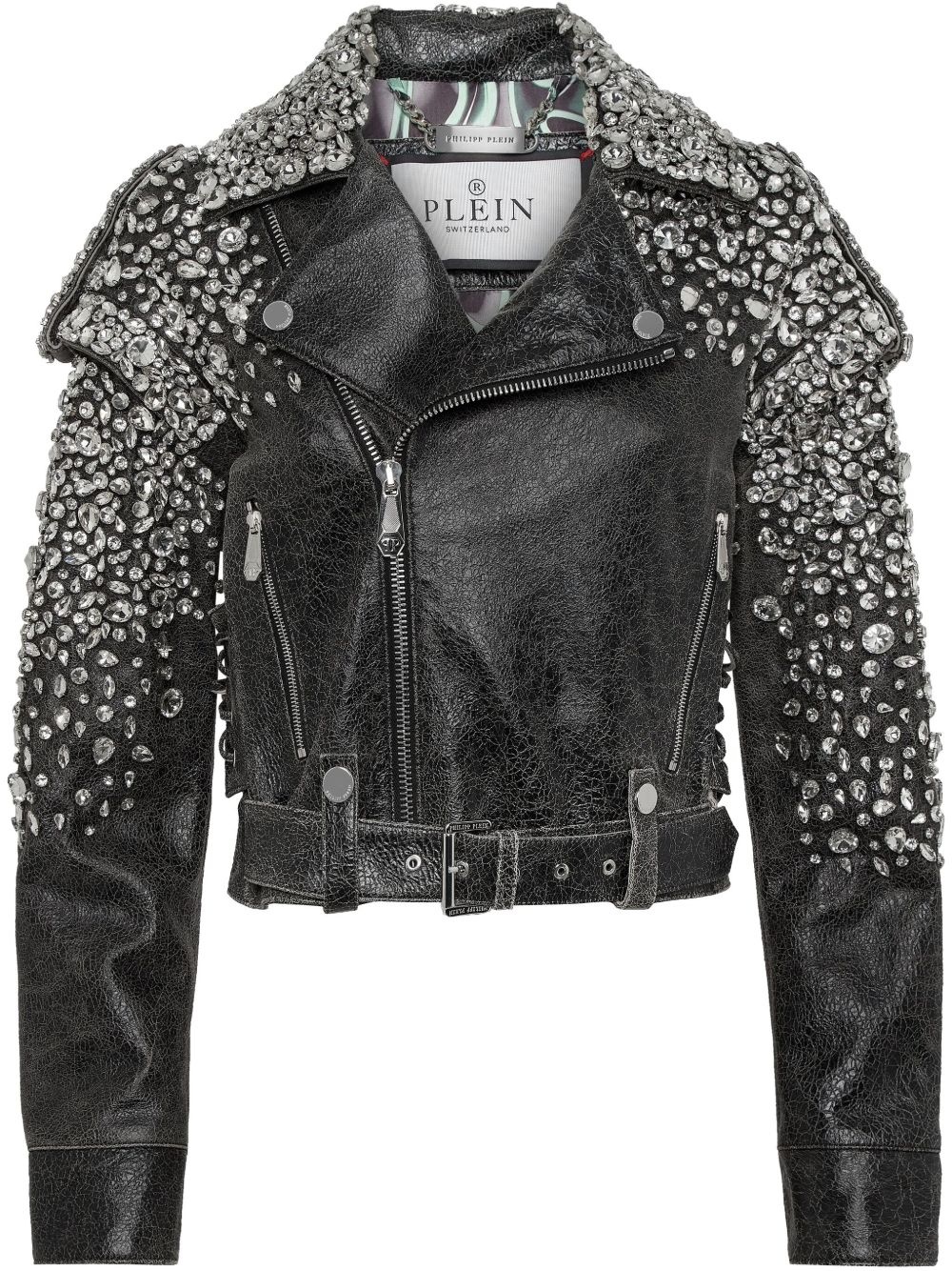 leather cropped jacket Highlights - Black - Front zip fastening - Two side zip-fastening pockets - Detachable waist belt - Crystal embellishment Imported Composition Lining: Polyamide 98%, Elastane 2% Outer: Lambskin 100%, Glass Fiber 100%