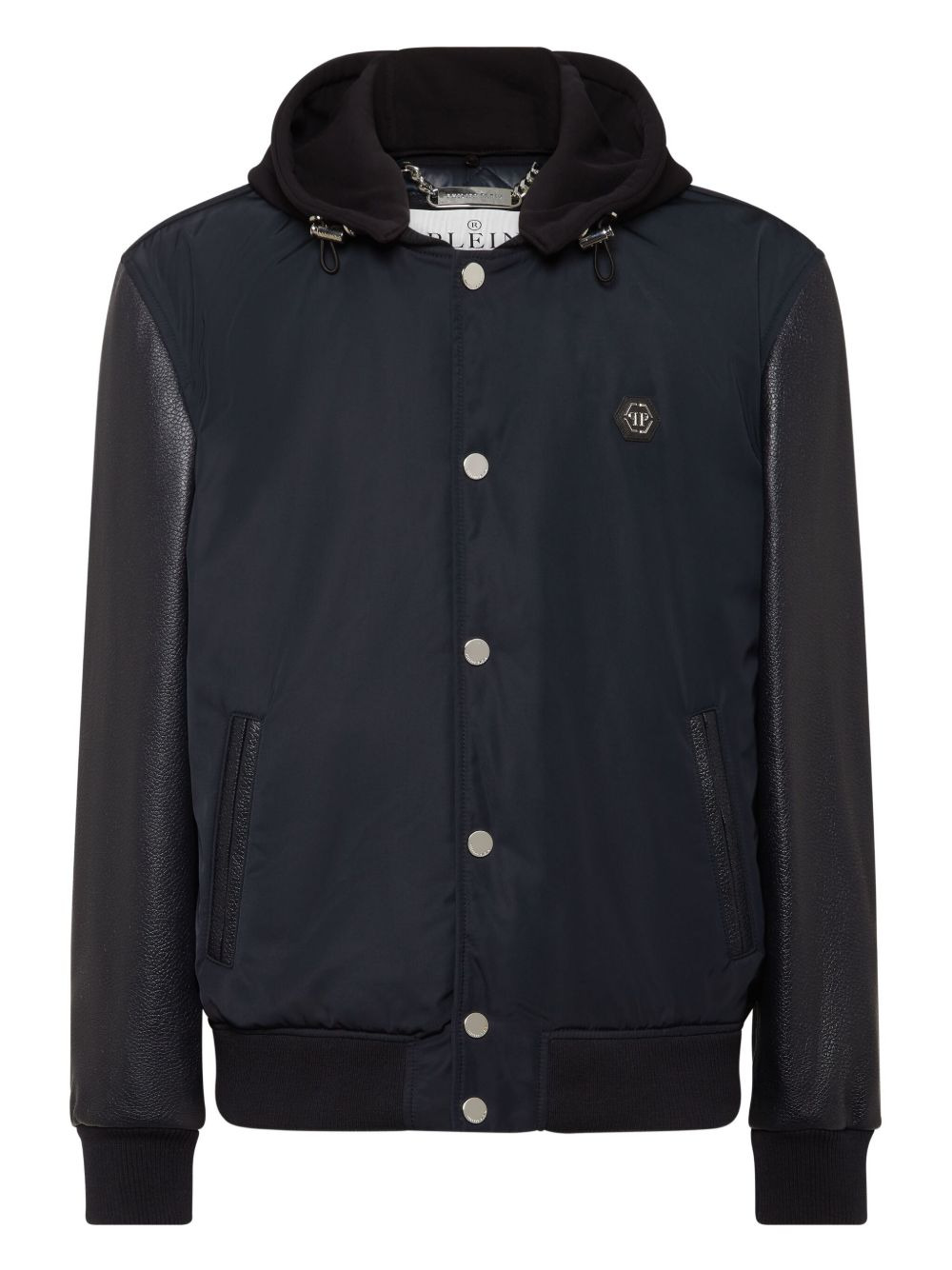 leather-sleeve hooded bomber jacket Highlights - Dark blue - Leather sleeves - Hooded neckline - Snap button fastening - Logo patch - Ribbed hem and cuffs Imported Composition Leather 100%, Fabric 100% Washing instructions Read Manufacturer Guidelines
