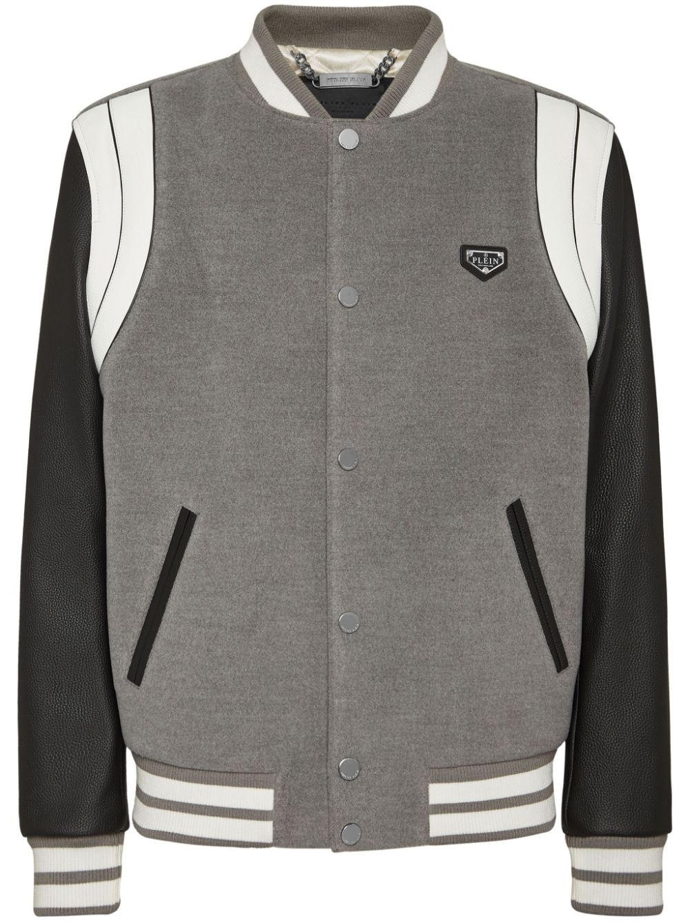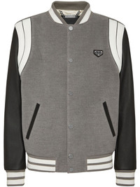 leather sleeves bomber jacket Highlights - Grey/white - Stripe detailing - Press-stud fastening - Ribbed band collar - Logo patch at the chest - Leather sleeves - Long sleeves - Two side slit pockets - Ribbed cuffs and hem Imported Composition Outer: Calf Leather 100%, Polyester 64%, Viscose 33%, Spandex/Elastane 3% Lining: Polyester 100%