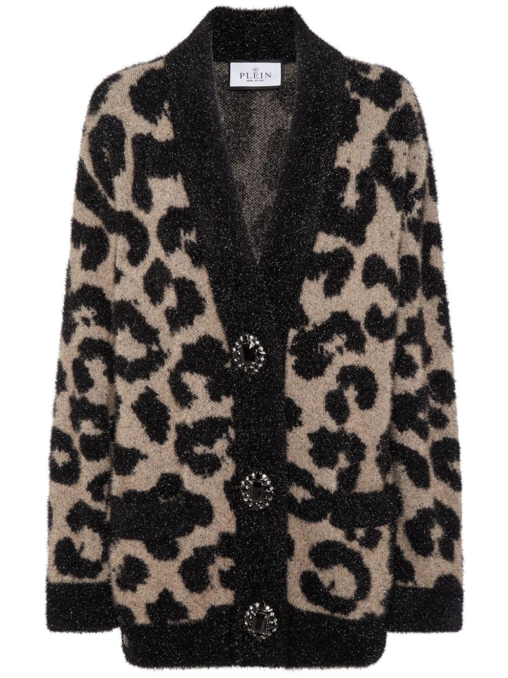 leopard-print lurex cardigan Highlights - Coffee brown/black - Knitted construction - Lurex detailing - All-over leopard print - Crystal-embellished buttons - V-neck - Front button fastening - Long sleeves - Two front welt pockets - Straight hem Made in Italy Composition Nylon 97%, Wool 3%