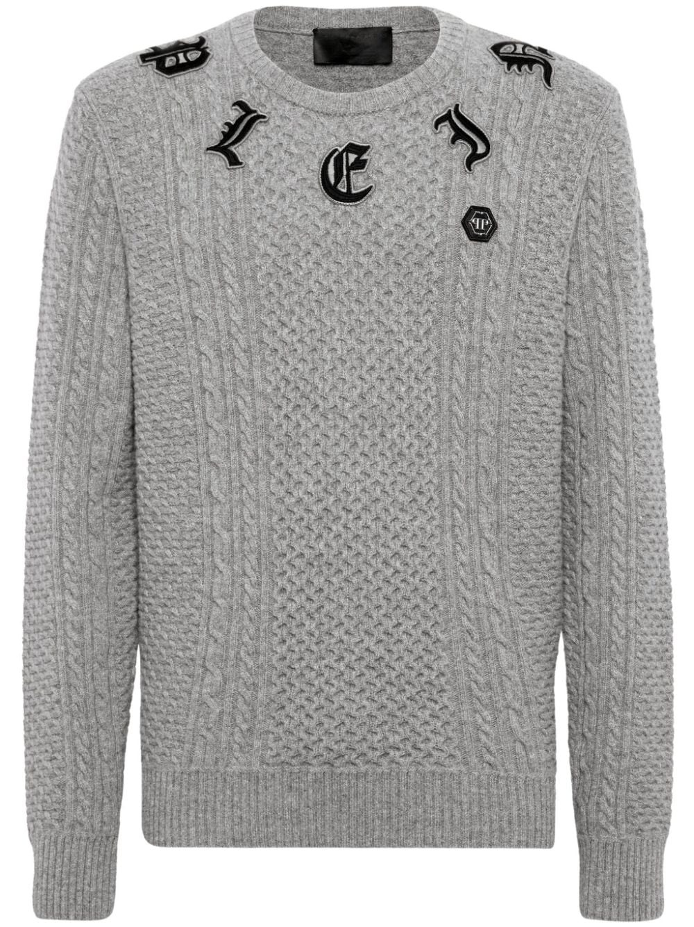 logo-applique cable-knit jumper Highlights - Medium grey - Merino wool-cashmere blend - Cable knit - Ribbed-knit edge - Applique logo - Silver-tone logo plaque - Crew neck - Long sleeves - Straight hem Made in Italy Composition RWS Merino Wool 90%, Cashmere 10%