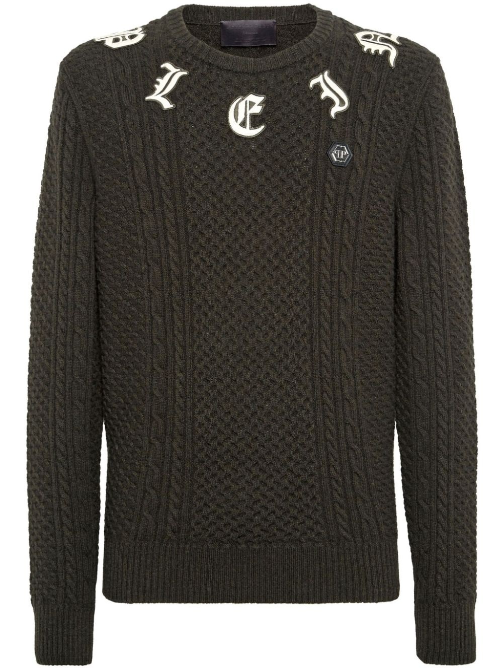 logo-applique cable-knit jumper Highlights - Dark green - Merino wool-cashmere blend - Cable knit - Ribbed-knit edge - Applique logo - Silver-tone logo plaque - Crew neck - Long sleeves - Straight hem Made in Italy Composition RWS Merino Wool 90%, Cashmere 10% Washing instructions Read Manufacturer Guidelines