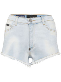 logo-applique denim shorts Highlights - Light blue - Cotton blend - Washed denim - Contrast stitching - Applique logo - Mini logo tag - Belt loops - Concealed fly and button fastening - High-waisted - Classic five pockets - Frayed hem - Thigh-length Imported Composition Outer: Cotton 92%, Polyester 6%, Spandex/Elastane 2% Lining: Polyester 65%, Cotton 35%