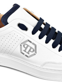 logo-applique lace-up sneakers Highlights - White/navy blue - Round toe - Applique logo - Perforated detailing - Front lace-up fastening - Contrasting heel counter - Branded leather insole - Flat rubber sole Made in Italy Composition Leather 100%