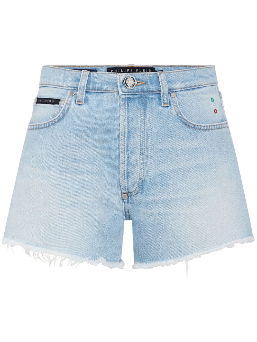 logo-appliqued denim mini shorts Highlights - Light blue - Stretch-cotton - Denim - Light wash - Whiskering effect at the thighs - Applique logo - Logo tag - Rivet detailing - Silver-tone hardware - Belt loops - Concealed fly and button fastening - Classic five pockets - Frayed hem Made in Italy Composition Outer: Cotton 99%, Elastane 1% Lining: Polyester 65%, Cotton 35%