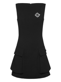 logo-embellished mini dress Highlights - Black - Embellished logo detailing - Two flap pockets - Back zip fastening - Thigh length Made in Italy Composition Outer: Viscose 100% Washing instructions Read Manufacturer Guidelines