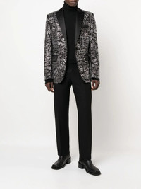 logo-embellished single-breasted blazer black stretch-wool logo embellishment chest welt pocket two side flap pockets front button fastening notched lapels long sleeves buttoned cuffs curved hem Made in Italy Composition Lining: Viscose 51%, Acetate 49% Outer: Polyester 53%, Wool 43%, Spandex/Elastane 4% SIZE & FIT Model measurements Height 6 ft 0 in(1.84 m) Bust/Chest 35.82 in(91 cm) Hips 37 in(94 cm) Waist 28.34 in(72 cm) FittingInformation This piece fits true to size. We recommend you get your regular size Cut for a slim fit Made with a mid-weight fabric