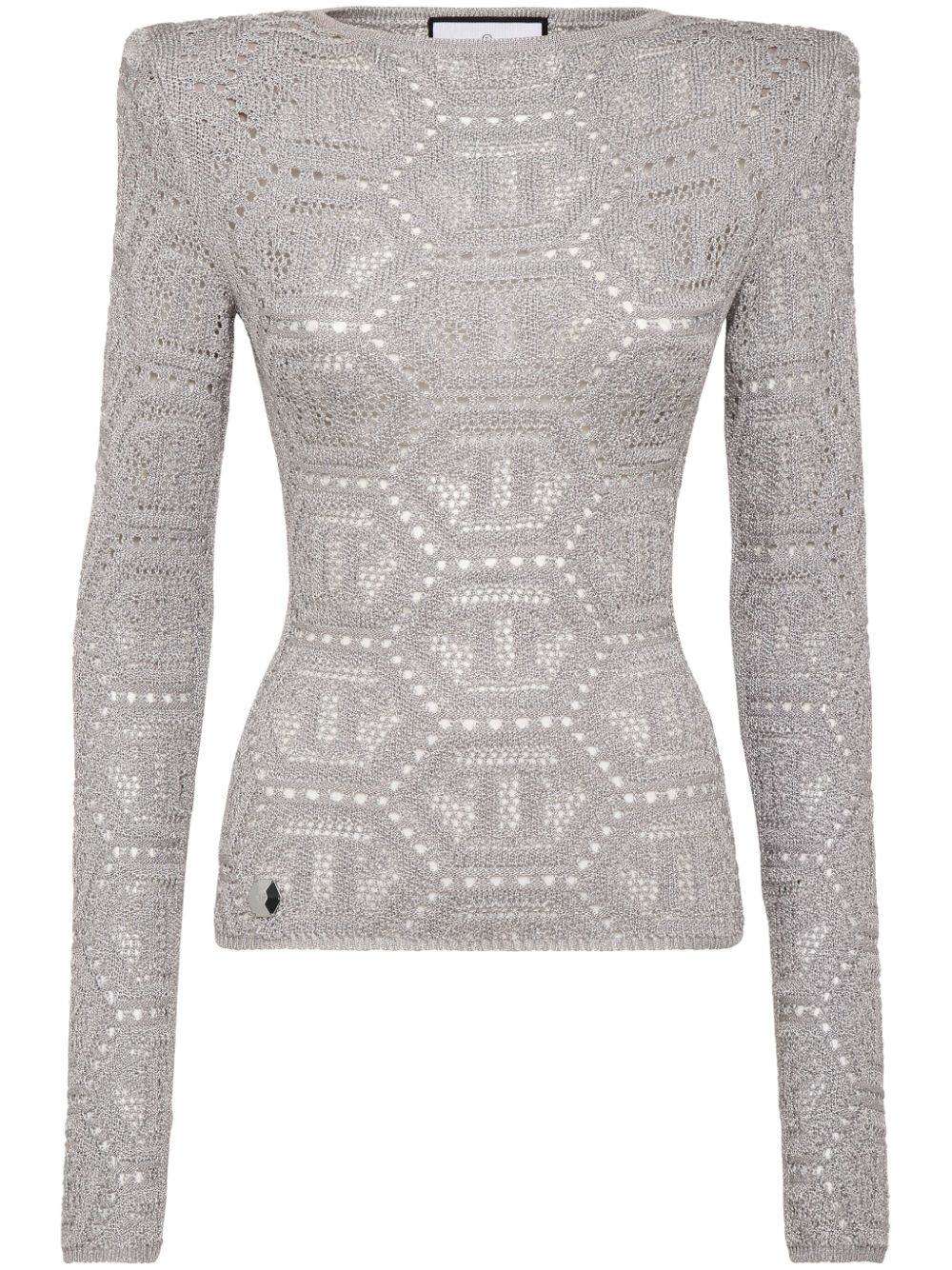 logo-embroidered knitted top Highlights - Medium grey - Logo patch to the front - Embroidered design - Shoulder pads - Round neck - Long sleeves - Straight hem Made in Italy Composition Acetate 78%, Metallized Polyester 12%, Polyamide 10% Washing instructions Read Manufacturer Guidelines
