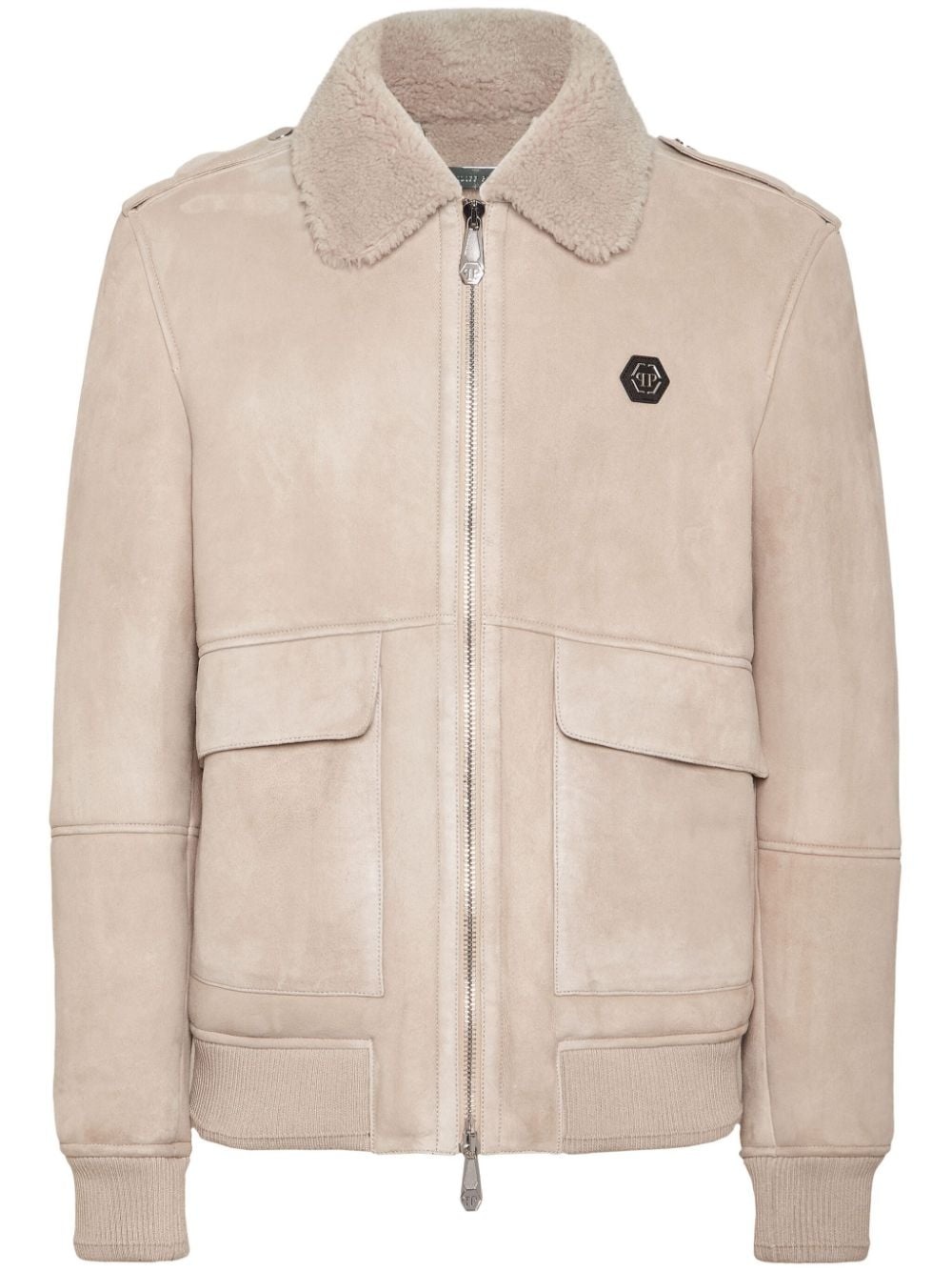 logo-patch jacket Highlights - Light beige - Sheepskin - Stretch-design - Shearling - Logo patch at the chest - Front zip fastening - Classic collar - Two front flap pockets - Long sleeves - Straight hem Imported Composition Sheep Skin/Shearling 100%, Polyester 98%, Elastane 2%