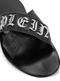 logo-plaque leather sandals Highlights - Black - Calf leather - Embossed crocodile effect - Branded footbed - Silver-tone logo plaque - Crossover strap detail - Round open toe - Flat rubber sole - Slip-on style Made in Italy Composition Outer: Calf Leather 100%, Zinc 100% Lining: Calf Leather 100%, Goat Skin 100% Sole: Calf Leather 100%
