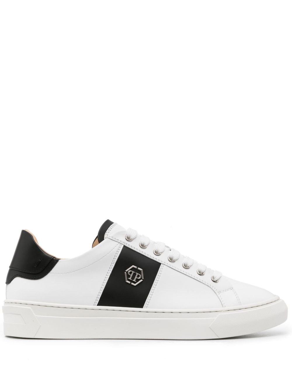 logo-plaque leather sneakers Highlights - White/black - Calf leather - Smooth grain - Panelled design - Silver-tone logo plaque - Metal eyelet detailing - Silver-tone hardware - Round toe - Front lace-up fastening - Branded leather insole - Flatform sole Made in Italy Composition Lining: Calf Leather 100% Outer: Calf Leather 100% Sole: Rubber 100% SIZE & FIT Measurement HEEL 1.37 in(3.5 cm) Sole height 1.18 in(3 cm)