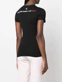 logo-print cotton T-shirt black cotton logo print to the front slogan print to the rear round neck short sleeves straight hem profanity included Imported Composition Cotton 100% SIZE & FIT Model measurements Height 5 ft 10 in(1.77 m) Bust/Chest 34.64 in(88 cm) Hips 35.43 in(90 cm) Waist 24.8 in(63 cm) FittingInformation This piece fits true to size. We recommend you get your regular size Cut for a slim fit Made with a mid-weight fabric Washing instructions Hand Wash