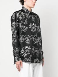 logo-print shirt black silk all-over logo print classic collar front button fastening long sleeves buttoned cuffs curved hem Made in Italy Composition Silk 100% SIZE & FIT Model measurements Height 6 ft 1 in(1.86 m) Bust/Chest 34.64 in(88 cm) Hips 35.43 in(90 cm) Waist 27.55 in(70 cm) FittingInformation This piece fits true to size. We recommend you get your regular size Cut for a loose fit Made with a lightweight non-stretch fabric Washing instructions Dry Clean Only