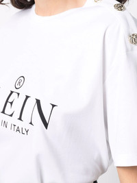logo-print short-sleeved T-shirt Philipp Plein's Made in Italy logo is printed to the front of this relaxed cotton T-shirt for SS22. Fashioned in Italy, it features a silver-tone logo plaque to the rear alongside three logo-embossed buttons at the shoulder. Made in Italy Composition Cotton 100% SIZE & FIT Model measurements Height 5 ft 10 in(1.79 m) Bust/Chest 33.07 in(84 cm) Hips 35.82 in(91 cm) Waist 24.01 in(61 cm) Washing instructions Hand Wash