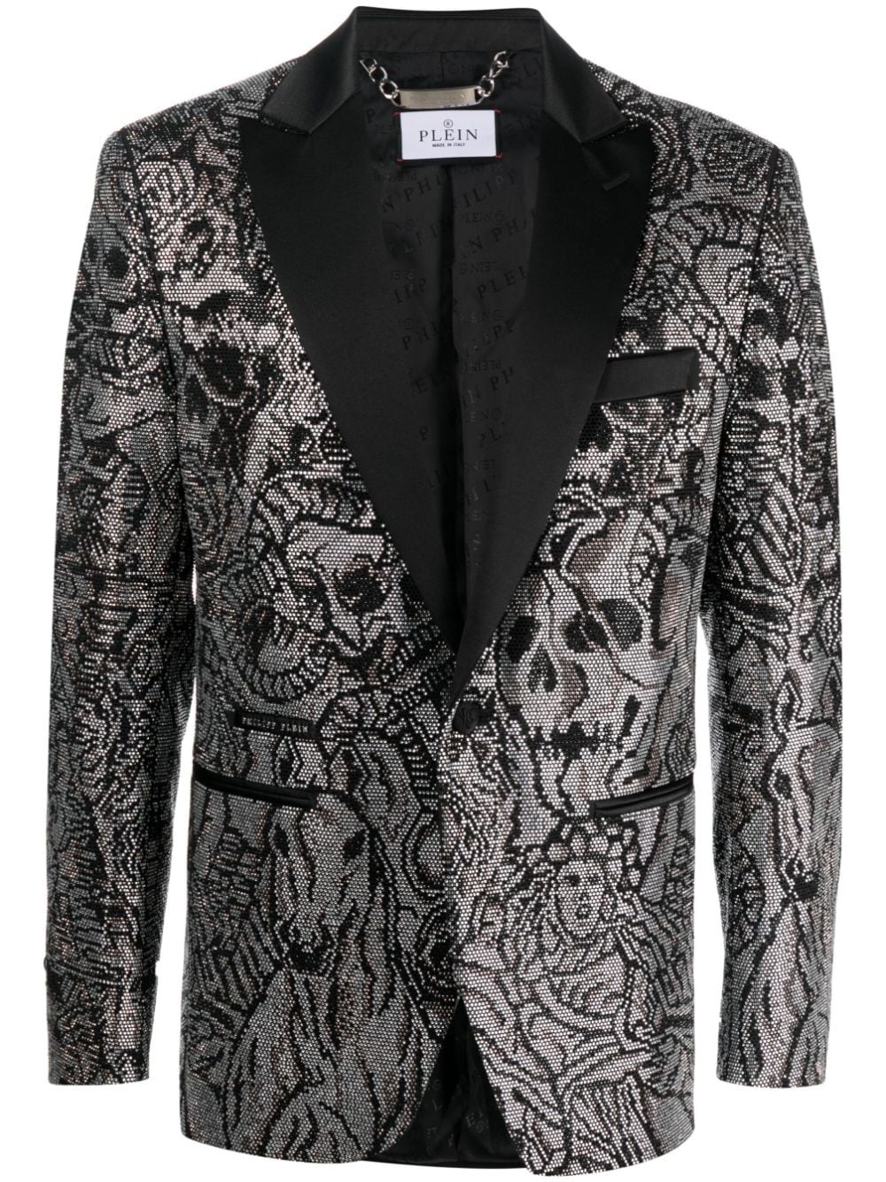 Lord Fit Tattoo blazer Highlights - Jet black/grey - All-over graphic print - Notched lapels - Single front button fastening - Long sleeves - Buttoned-cuff sleeves - Two front jetted pockets - Chest welt pocket - Straight hem Made in Italy Composition Outer: glass 100%, Polyester 52%, Wool 43%, Spandex/Elastane 5% Lining: Viscose 51%, Acetate 49% SIZE & FIT Model measurements Height 6 ft 2 in(1.87 m) Bust/Chest 36.41 in(92.5 cm) Hips 35.43 in(90 cm) Waist 29.52 in(75 cm) FittingInformation Designed for a slim fit, offering a comfortable fit that sits just away from the body The vented hem offers movement at the rear Made from a midweight fabric This piece fits true to size – take your usual size