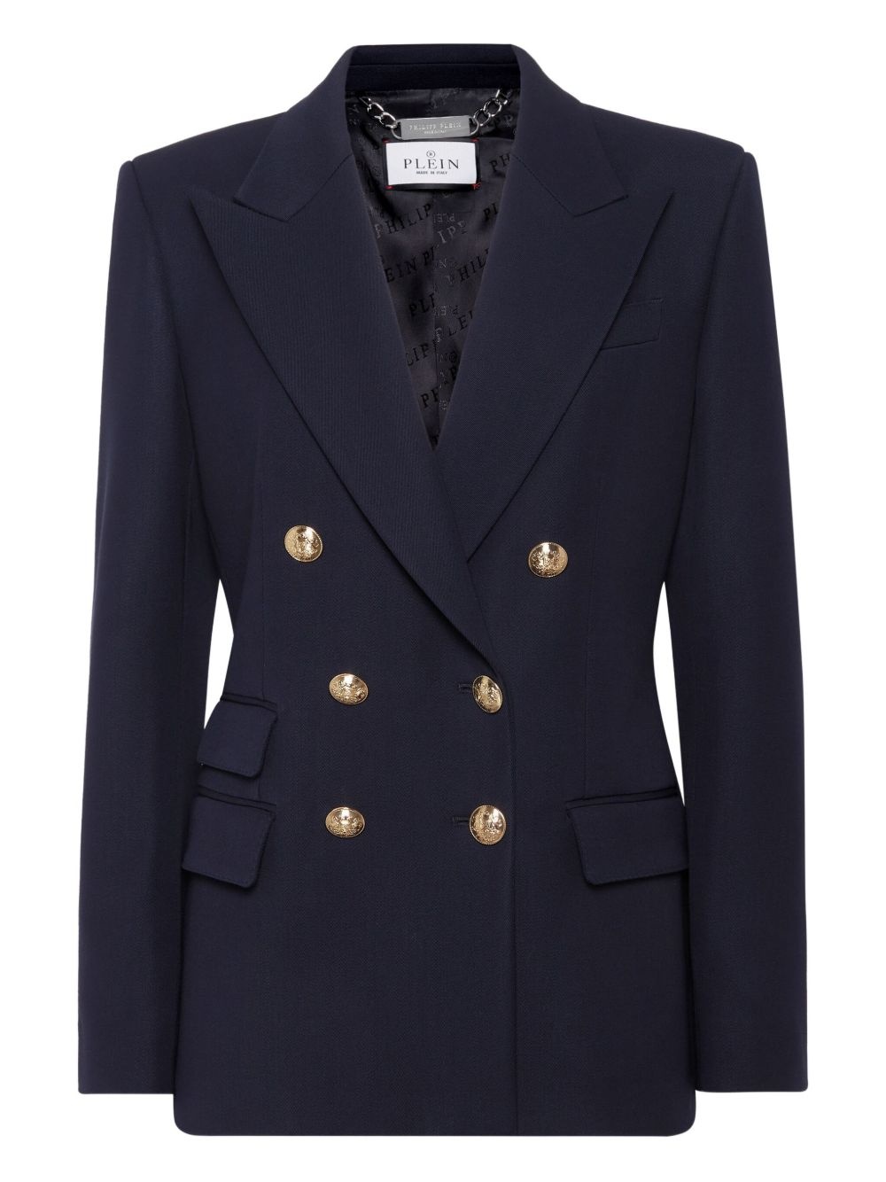 Marine double-breasted blazer Highlights - Navy blue - Double-breasted button fastening - Graphic print to the rear - Long sleeves Made in Italy Composition Outer: glass 100%, Polyester 55%, Wool 45% Lining: Viscose 51%, Acetate 49%