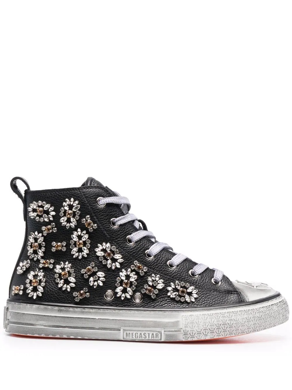 Megastar crystal-embellished high-top sneakers Highlights - Black - Leather - Crystal embellishment - Flat rubber sole - Front lace-up fastening - Round toe Made in Italy Composition Leather 100% SIZE & FIT Measurement HEEL 1.18 in(3 cm) HEIGHT 4.33 in(11 cm) Sole height 0.78 in(2 cm)