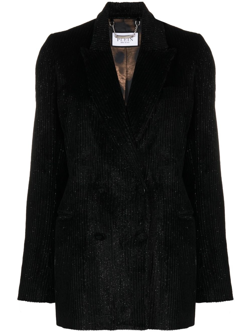 metallic corduroy blazer An understated mix of pattern and lustre elevate the boxy, single-breasted silhouette of this Phillip Plein blazer. It’s tailored in Italy from plush corduroy that’s woven with flecks of metallic fibres for subtle shimmer. Highlights - Black - Peak lapels - Shoulder pads - Long sleeves - Buttoned cuffs - Front button fastening - Chest welt pocket - Two side welt pockets - Full lining Made in Italy Composition Outer: Polyester 85%, Polyamide 12%, Spandex/Elastane 3% Lining: Polyester 100% SIZE & FIT Model measurements Height 5 ft 10 in(1.78 m) Bust/Chest 29.92 in(76 cm) Hips 34.64 in(88 cm) Waist 23.62 in(60 cm) FittingInformation Designed for a slim fit that sits just away from the body offering a close yet comfortable fit The internal shoulder pads offer a structured shape Made from a midweight stretch fabric, this piece offers elasticity and flexibility when worn This piece fits true to size – take your usual size Washing instructions Dry Clean Only